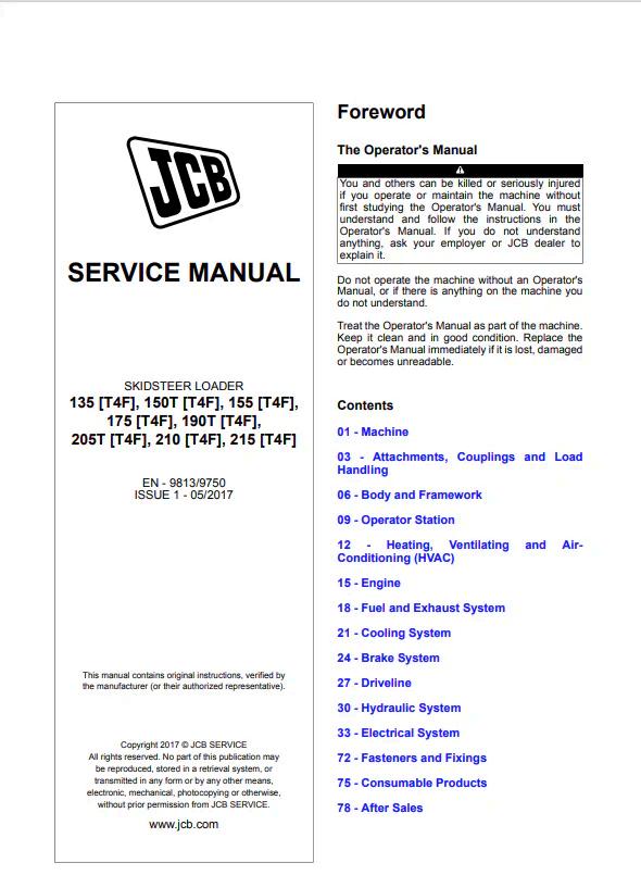 Comprehensive service manual for JCB Skid Steer Loader models 135, 150T, 155, 175, 190T, 205T, 210, and 215 (T4F variants). Document references 9813/9750. This technical resource covers maintenance procedures, troubleshooting, component specifications, and repair protocols essential for equipment operators and technicians. Ideal for ensuring optimal performance and extending machine lifespan through proper servicing schedules and preventive care guidelines.