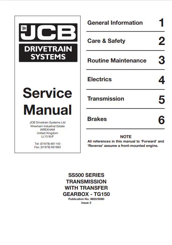 JCB SS500 Series Transmission With Transfer Gearbox TG150 Service Manual 9803/9060 PDF Comprehensive service documentation for the JCB SS500 Series transmission system paired with the TG150 transfer gearbox. This manual (reference 9803/9060) provides detailed technical specifications, maintenance procedures, diagnostic protocols, and repair instructions essential for technicians and equipment operators. Covers assembly, disassembly, troubleshooting, and component replacement with precision engineering standards. Ideal for workshop professionals, fleet maintenance teams, and authorized service centers requiring authoritative guidance on transmission performance and longevity.