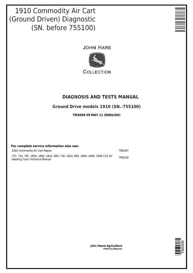 John Deere 1910 Commodity Air Cart (Ground Driven) Diagnostic Diagnosis and Test Manual TM2068 PDF This comprehensive diagnostic and test manual provides technicians and operators with detailed procedures for troubleshooting and servicing the John Deere 1910 ground-driven commodity air cart. The TM2068 manual covers diagnostic protocols, system testing methodologies, and repair specifications essential for maintaining optimal equipment performance. Ideal for authorized dealers, service centers, and experienced operators requiring factory-level technical documentation for accurate problem identification and resolution.