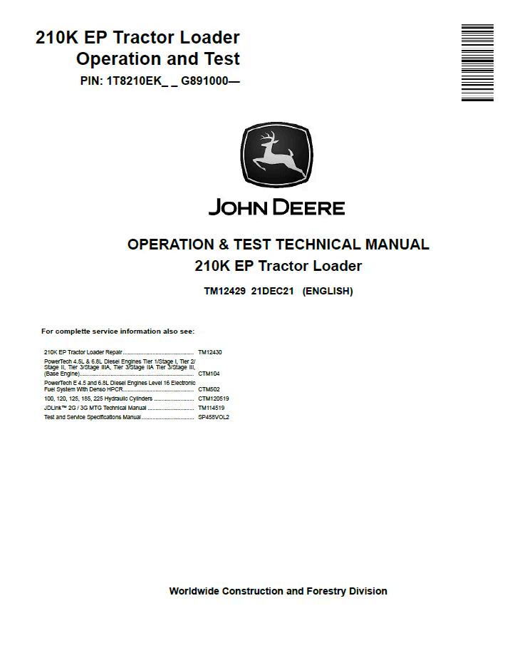 John Deere 210K EP TRACTOR LOADER Operation and Test Technical Manual TM12429 provides comprehensive technical documentation for equipment operators, technicians, and maintenance personnel. This official manual covers operational procedures, diagnostic testing protocols, and troubleshooting guidance specific to the 210K EP model. Ideal for training, reference, and compliance documentation, this PDF resource ensures proper equipment handling and optimal performance. Essential for fleet managers and service departments requiring authoritative technical specifications and maintenance schedules.