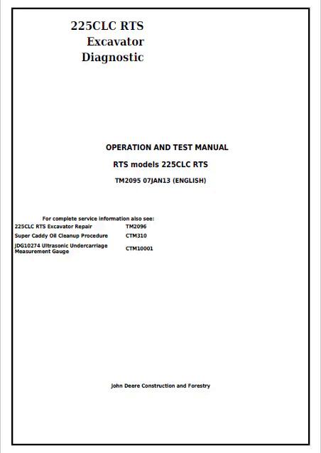 John Deere 225CLC RTS Excavator Operation and Test Manual TM2095 provides comprehensive technical documentation for operating, maintaining, and troubleshooting this heavy-duty excavator model. This PDF manual covers detailed procedures for equipment startup, operation protocols, diagnostic testing, and routine maintenance schedules. Essential for operators, technicians, and fleet managers seeking reliable reference material. Includes specifications, safety guidelines, and component identification to maximize equipment performance and longevity. Instant digital access—no shipping required.