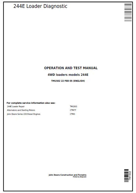 John Deere 244E Loader Diagnostic Operation and Test Manual TM1502 provides comprehensive technical guidance for diagnosing and testing this compact wheel loader. This PDF manual delivers detailed procedures for operational checks, system diagnostics, and troubleshooting to ensure optimal equipment performance. Essential for technicians and operators requiring factory-standard maintenance protocols and repair specifications. Covers hydraulic systems, engine diagnostics, electrical components, and loader functions with precision technical data and step-by-step instructions for accurate service and maintenance.