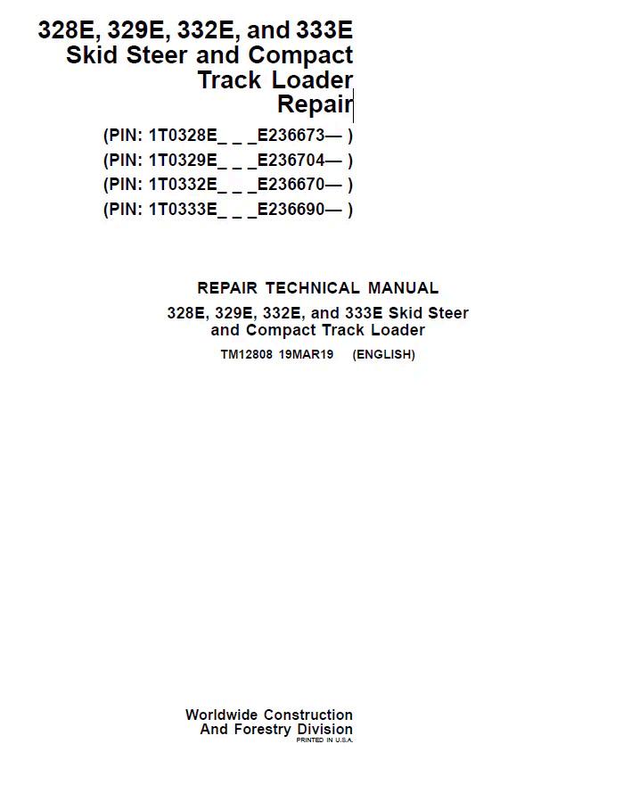 John Deere 328E, 329E, 332E, and 333E Skid Steer and Compact Track Loader Repair Technical Manual TM12808 PDF Comprehensive factory repair documentation for John Deere skid steer and compact track loaders. This official technical manual (TM12808) covers models 328E, 329E, 332E, and 333E with detailed service procedures, diagnostic protocols, and component specifications. Essential resource for technicians and operators requiring authoritative maintenance and troubleshooting guidance. Digital PDF format enables immediate access and searchable content for efficient problem resolution.