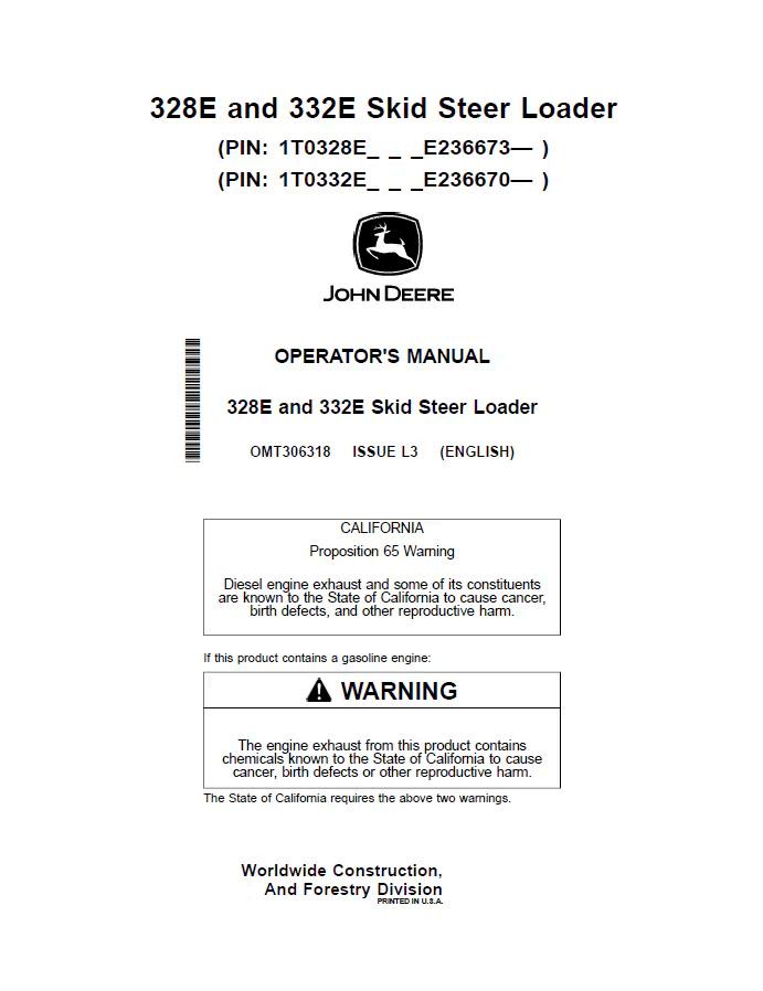 John Deere 328E and 332E Skid Steer Loader Operator Manual OMT306318 provides comprehensive guidance for equipment operation, maintenance, and troubleshooting. This official documentation covers safety protocols, control systems, hydraulic functions, and routine service procedures essential for optimal machine performance. Ideal for operators, technicians, and fleet managers requiring authoritative reference material. Digital PDF format ensures immediate access and convenient on-site consultation.