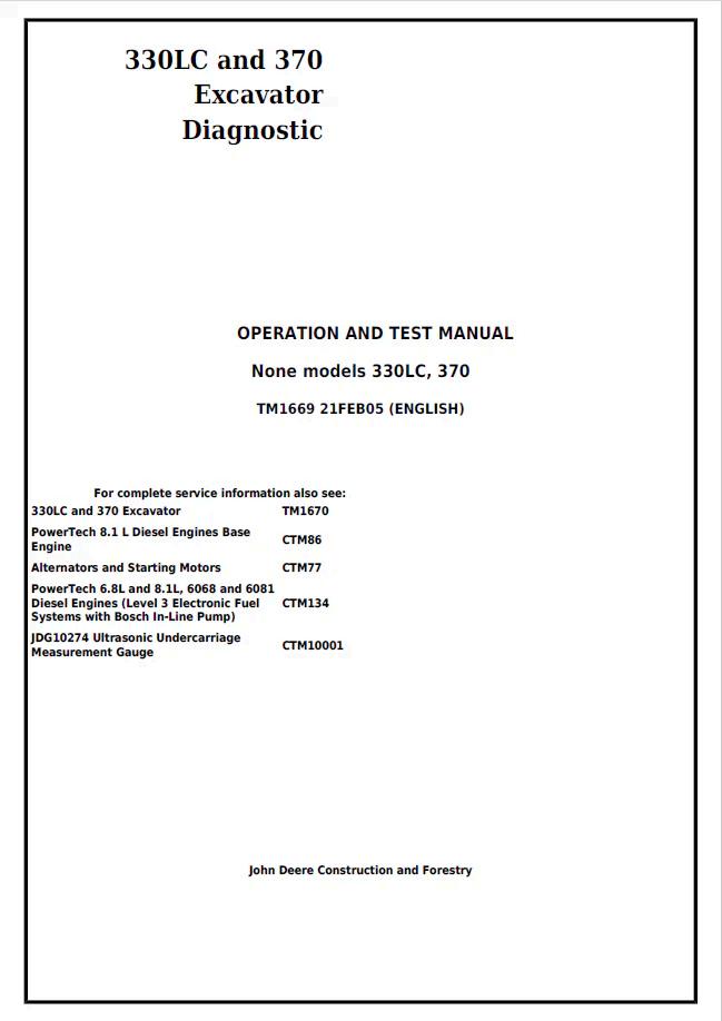John Deere 330LC and 370 Excavator Diagnostic Operation and Test Manual TM1669 provides comprehensive technical guidance for service technicians and equipment operators. This official diagnostic manual covers systematic troubleshooting procedures, operational protocols, and testing methodologies specific to these excavator models. Essential for maintenance personnel, fleet managers, and authorized dealers, it delivers detailed specifications and step-by-step diagnostic sequences to maximize equipment uptime and performance. Ideal for professional workshop environments and field service operations.