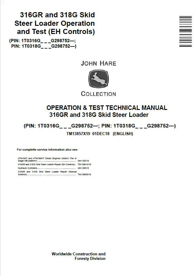 John Deere 3316GR and 318G Skid Steer Loader Operation and Test Manual TM13857X19 provides comprehensive technical guidance for equipment operators and technicians. This official manual covers operational procedures, maintenance protocols, and diagnostic testing procedures essential for optimal machine performance. Designed for professional use, it delivers detailed specifications and troubleshooting solutions to maximize uptime and equipment longevity. An indispensable resource for fleet managers and service personnel.