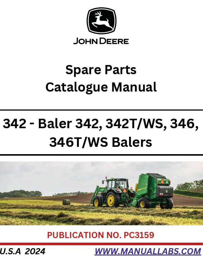 John Deere 342 Baler 342, 342T/WS, 346, 346T/WS Balers Parts Catalogue Manual PC3159 PDF Complete parts catalogue and reference manual for John Deere 342 and 346 baler series. This comprehensive PDF guide covers all model variants including the 342T/WS and 346T/WS configurations. Essential documentation for technicians, operators, and maintenance professionals requiring detailed parts identification, assembly diagrams, and component specifications. Streamline repairs, maintenance, and parts ordering with accurate technical information and exploded views. Ideal for workshop reference or field troubleshooting.