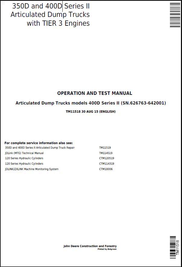 John Deere 350D and 400D Series II Articulated Dump Truck Operation and Test Manual TM11518 PDF Comprehensive technical manual covering operation, maintenance, and diagnostic procedures for John Deere 350D and 400D Series II articulated dump trucks. This official TM11518 documentation provides detailed guidance on equipment setup, safe operating practices, troubleshooting protocols, and performance testing. Essential resource for operators, technicians, and fleet managers requiring authoritative specifications and procedural information for these heavy-duty hauling vehicles. Digital PDF format enables quick reference and easy distribution across your team.