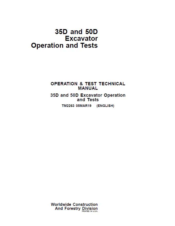 John Deere 35D and 50D Excavator Operation and Test Technical Manual TM2263 provides comprehensive guidance for equipment operators and technicians. This official documentation covers operational procedures, maintenance protocols, and diagnostic testing for both the 35D and 50D excavator models. Essential for training personnel, troubleshooting mechanical issues, and ensuring optimal equipment performance. Digital PDF format enables quick reference on-site or in the shop. Ideal for fleet managers, service departments, and equipment operators requiring authoritative technical specifications and procedural standards.