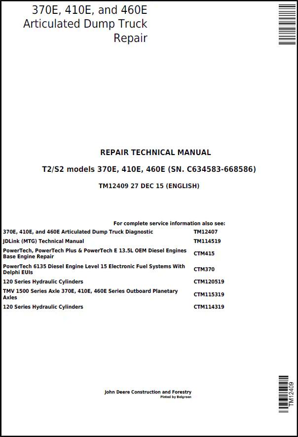 John Deere 370E, 410E, and 460E Articulated Dump Truck Repair Technical Manual TM12409 provides comprehensive service and maintenance guidance for these heavy-duty dump truck models. This official technical manual covers diagnostics, troubleshooting, component repair procedures, and system specifications essential for fleet maintenance and field repairs. Ideal for technicians, operators, and equipment managers requiring authoritative documentation to maintain peak performance and minimize downtime on these articulated haulers.