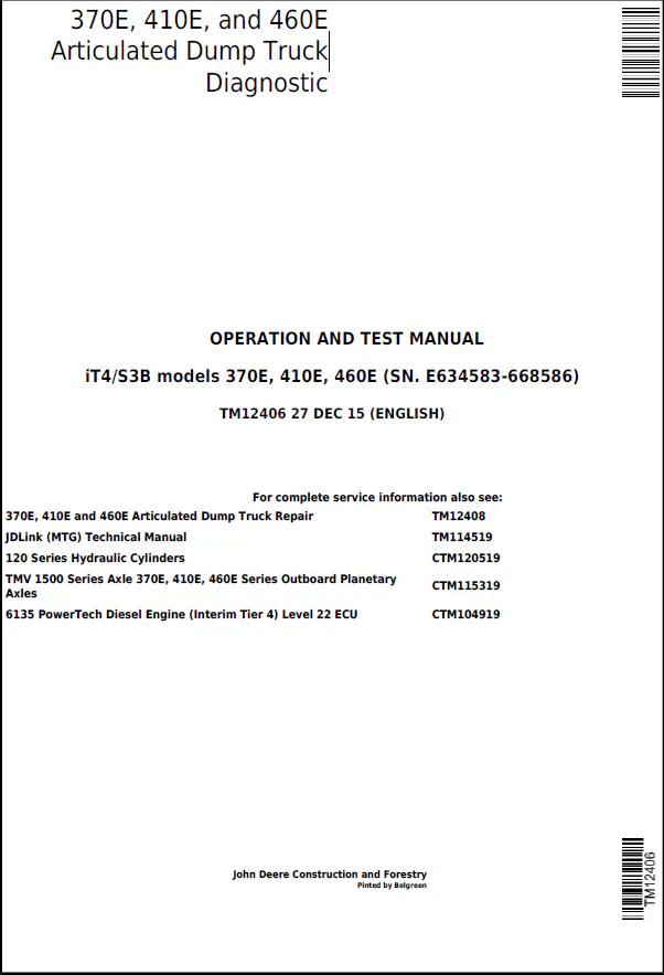 John Deere 370E, 410E, and 460E Articulated Dump Truck Operation and Test Manual TM12406 provides comprehensive technical documentation for operating, maintaining, and diagnosing these heavy-duty dump trucks. This official manual covers essential procedures for equipment operators, technicians, and fleet managers. Access critical information on engine performance, hydraulic systems, transmission operation, and diagnostic testing protocols. Ideal for training personnel, troubleshooting mechanical issues, and ensuring compliance with manufacturer specifications. Digital PDF format enables quick reference on-site or in the shop.