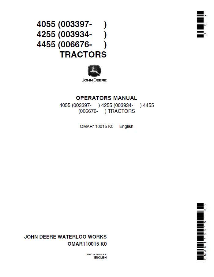 John Deere 4055, 4255, and 4455 Tractors Operator Manual (OMAR110015) provides comprehensive guidance for equipment operators and maintenance personnel. This PDF manual covers essential operating procedures, safety protocols, routine maintenance schedules, and troubleshooting for these mid-range utility tractor models. Ideal for farm operations, contractors, and equipment managers seeking reliable technical documentation to maximize uptime and ensure proper machine operation. Digital format allows instant access across devices.