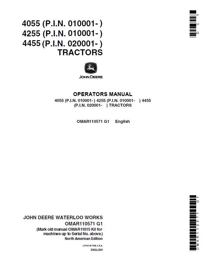 John Deere 4055, 4255, and 4455 Tractors Operator Manual (OMAR110571) provides comprehensive guidance for equipment operators and maintenance personnel. This PDF manual covers essential operating procedures, safety protocols, routine maintenance schedules, and troubleshooting for these mid-range utility tractor models. Ideal for farm operations, contractors, and equipment managers seeking reliable technical documentation to maximize uptime and ensure proper equipment handling. Digital format allows instant access across devices.