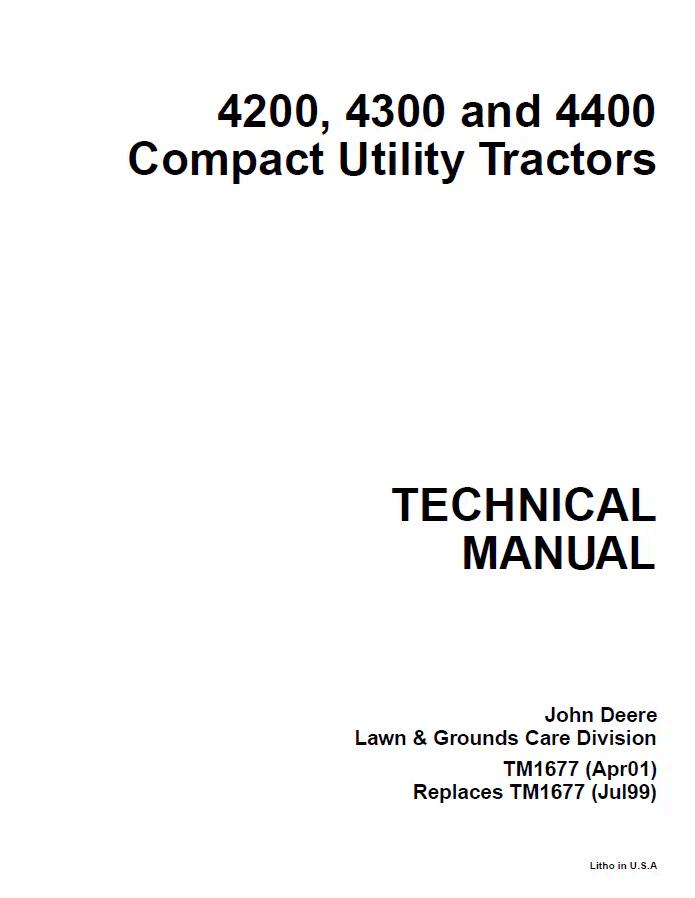 John Deere 4200, 4300, and 4400 Compact Utility Tractors Technical Manual TM1677 provides comprehensive service and repair documentation for these three tractor models. This official manual covers engine specifications, hydraulic systems, electrical schematics, transmission details, and maintenance procedures. Essential for technicians, operators, and equipment managers performing diagnostics, repairs, or routine servicing. Includes detailed diagrams, torque specifications, and troubleshooting guidance. Digital PDF format ensures immediate access to critical technical information.