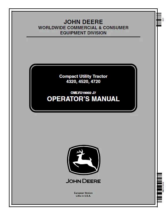 John Deere 4320, 4520, and 4720 Compact Utility Tractor Operator Manual (OMLVU19002) in PDF format. This comprehensive guide covers operation, maintenance, and troubleshooting for these three tractor models. Essential reference material for operators and technicians seeking detailed specifications, safety procedures, and service information. Digital format ensures convenient access on any device for field or shop use.