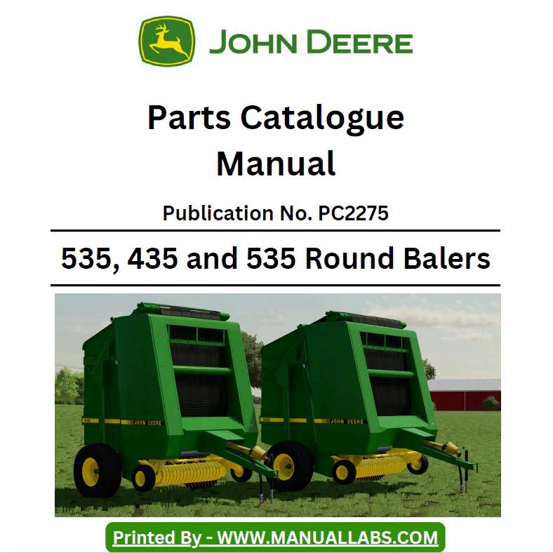 John Deere 535, 435 and 535 Round Balers Parts Catalog Manual PC2275 PDF Comprehensive parts reference guide for John Deere round balers covering models 535, 435, and 535. This official PC2275 catalog provides detailed component identification, part numbers, and assembly diagrams essential for maintenance, repair, and parts ordering. Ideal for operators, technicians, and equipment managers requiring accurate specifications and cross-reference information for these baler models.