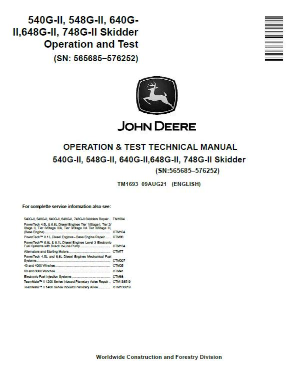 John Deere 540G-II, 548G-II, 640G-II, 648G-II, and 748G-II Skidder Operation and Test Technical Manual (TM1693). This comprehensive PDF guide covers operational procedures, maintenance protocols, and diagnostic testing for all five skidder models. Essential reference material for equipment operators, technicians, and service professionals. Includes detailed specifications, troubleshooting procedures, and performance testing standards. Ideal for ensuring optimal machine performance and compliance with manufacturer guidelines.