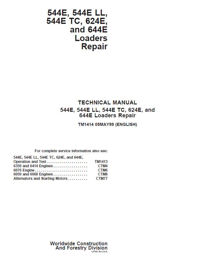 Comprehensive technical repair manual for John Deere wheel loaders covering models 544E, 544E LL, 544E TC, 624E, and 644E. This TM1414 documentation provides detailed service procedures, diagnostic information, and maintenance protocols essential for technicians and operators. Access complete specifications, troubleshooting guides, and component repair instructions in PDF format. Ideal for workshop professionals, fleet managers, and equipment owners requiring authoritative repair documentation for these heavy-duty loader models.