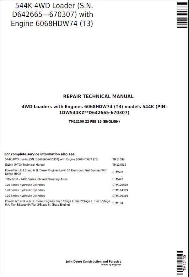 John Deere 544K 4WD Loader Repair Technical Manual TM12100 provides comprehensive service and maintenance guidance for this heavy-duty wheel loader. This official technical documentation covers diagnostics, troubleshooting, component repair procedures, and specifications essential for technicians and operators. The manual delivers detailed schematics, torque values, and step-by-step instructions to ensure proper equipment maintenance and minimize downtime. Ideal for service centers, fleet managers, and experienced operators requiring authoritative repair information for the 544K model.