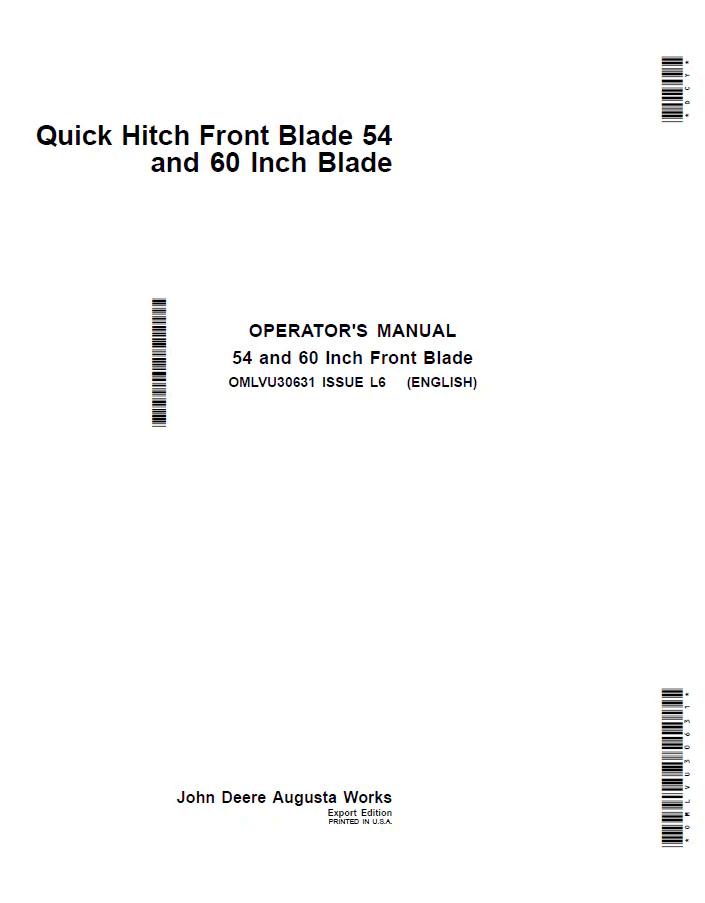 John Deere 54 and 60 Quick Hitch Front Blade Operator Manual (OMLVU30631) provides comprehensive guidance for safe and effective equipment operation. This official documentation covers setup, maintenance procedures, troubleshooting, and operational best practices for quick hitch front blade systems. Essential reference material for equipment owners and operators seeking detailed technical specifications and proper handling protocols. Digital PDF format ensures convenient access to critical information whenever needed.