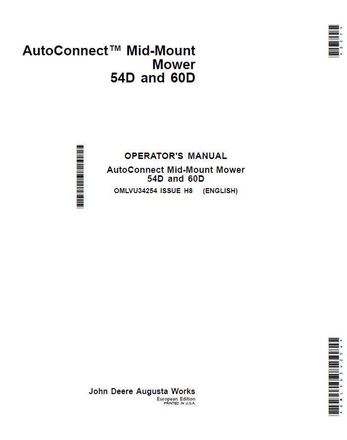 John Deere 54D and 60D AutoConnect Mid-Mount Mower Operator Manual (OMLVU34254) provides comprehensive guidance for equipment operation, maintenance, and troubleshooting. This essential reference document covers safety protocols, operational procedures, and routine service requirements specific to these mid-mount mower models. Ideal for operators and technicians seeking reliable technical documentation to maximize equipment performance and longevity. Digital PDF format ensures convenient access to critical information whenever needed.