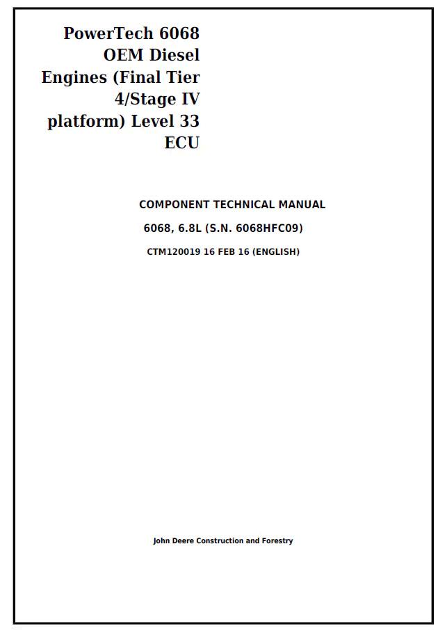 John Deere 6068, 6.8L Diesel Engines (Final Tier 4/Stage IV platform) Level 33 ECU Component Technical Manual CTM120019 PDF Comprehensive technical reference for John Deere 6068 and 6.8L diesel engine systems operating under Final Tier 4/Stage IV emissions standards. This Level 33 ECU Component Technical Manual (CTM120019) provides detailed specifications, diagnostic procedures, and component architecture for engine control unit functionality. Essential resource for technicians, service centers, and equipment operators requiring in-depth knowledge of engine management systems, emissions control integration, and electronic component performance. PDF format enables quick access to critical technical data for maintenance, troubleshooting, and system optimization.