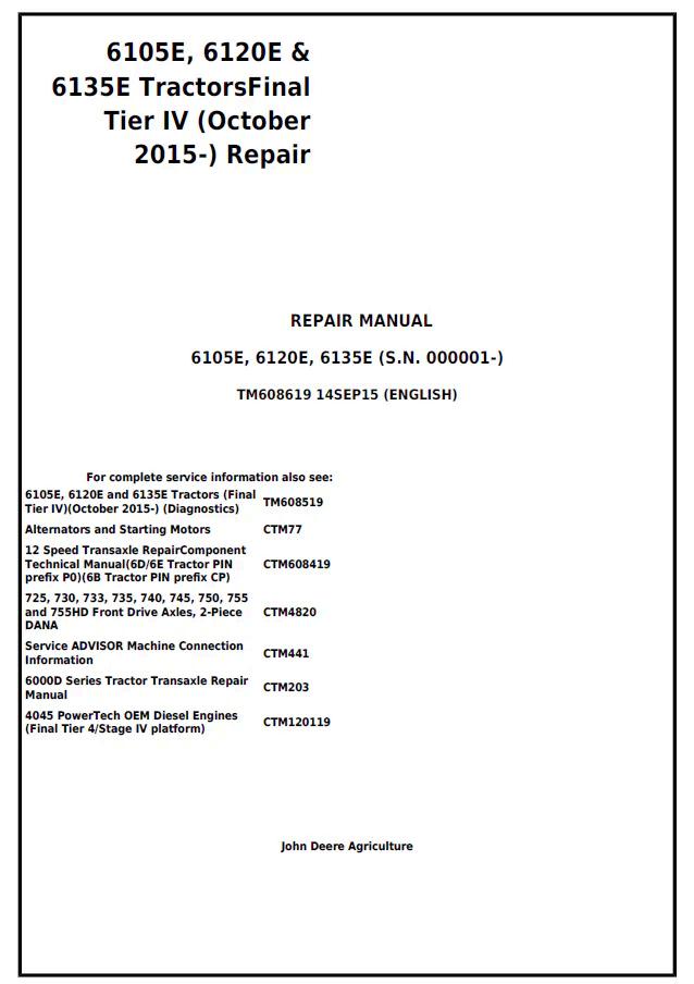 This comprehensive repair manual (TM608619) covers John Deere 6105E, 6120E, and 6135E Final Tier IV tractors with detailed technical specifications and service procedures. Designed for qualified technicians and service professionals, it addresses engine diagnostics, fuel systems, cooling systems, transmission overhaul, hydraulic circuits, and electrical troubleshooting. Features factory-approved repair sequences, torque specifications, and component replacement guidelines. Indispensable for authorized dealers, independent repair shops, and equipment managers maintaining these robust utility-class tractors in peak operational condition.