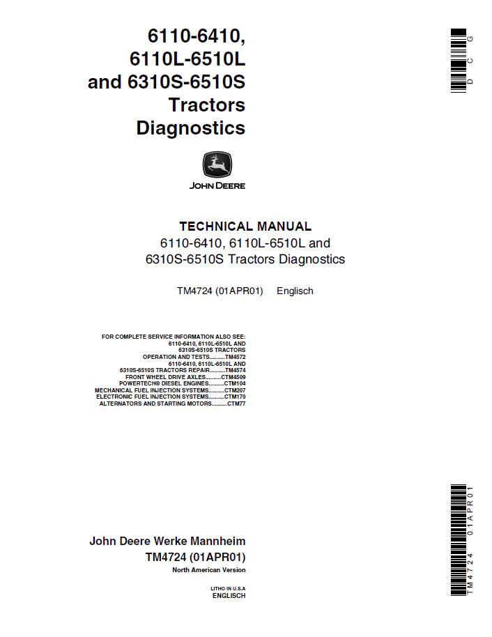 John Deere 6110-6410, 6110L-6510L and 6310S-6510S Tractor Technical Manual TM4724 PDF Comprehensive technical documentation for John Deere mid-range tractor models. This official manual covers operation, maintenance, diagnostics, and repair procedures for the 6110, 6210, 6310, 6410, and their L and S series variants. Essential reference for technicians, operators, and service professionals requiring detailed specifications, troubleshooting guides, and component information. Digital PDF format enables quick access to critical service data and ensures compliance with manufacturer standards.