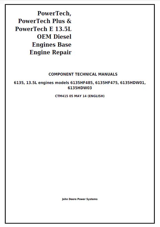 John Deere 6135 13.5L Diesel Engine Base Engine Repair Component Technical Manual CTM415 provides comprehensive technical documentation for engine maintenance and repair operations. This PDF manual delivers detailed specifications, component diagrams, and step-by-step repair procedures essential for technicians and equipment operators. Access critical information on engine assembly, disassembly, troubleshooting, and component replacement with precision guidance. Ideal for service centers, fleet managers, and experienced mechanics requiring authoritative repair documentation for John Deere diesel engine systems.