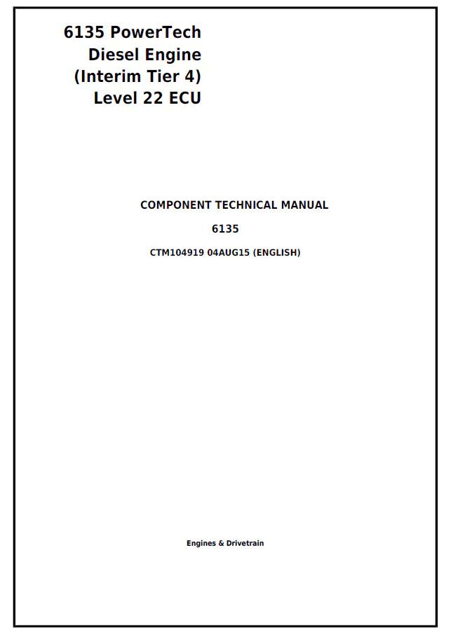 John Deere 6135 Powertech Diesel Engine (Interim Tier 4) Level 22 ECU Component Technical Manual CTM104919 PDF Comprehensive technical documentation for the John Deere 6135 Powertech diesel engine equipped with Interim Tier 4 emissions compliance. This Level 22 ECU component manual (CTM104919) provides detailed specifications, diagnostic procedures, and service protocols essential for technicians and engineers. Covers electronic control unit architecture, sensor integration, fuel injection systems, and emissions management. Ideal for maintenance, troubleshooting, and component replacement on heavy equipment utilizing this engine platform. Digital PDF format ensures immediate access to critical technical data.