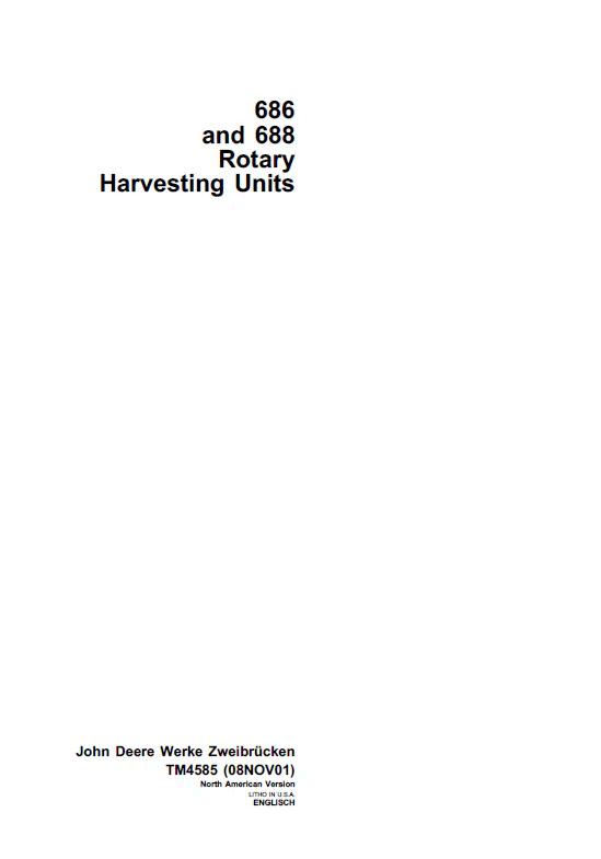 John Deere 686 and 688 Rotary Harvesting Unit Technical Manual TM4585 PDF Official technical reference for John Deere 686 and 688 rotary harvesting equipment. This TM4585 manual provides in-depth coverage of rotary cutting mechanisms, drive systems, adjustment procedures, and maintenance protocols. Includes detailed diagrams, component specifications, diagnostic procedures, and repair instructions for optimal equipment performance. Essential resource for service technicians, equipment operators, and maintenance personnel. Instant digital access via PDF format for on-site consultation and workshop documentation.