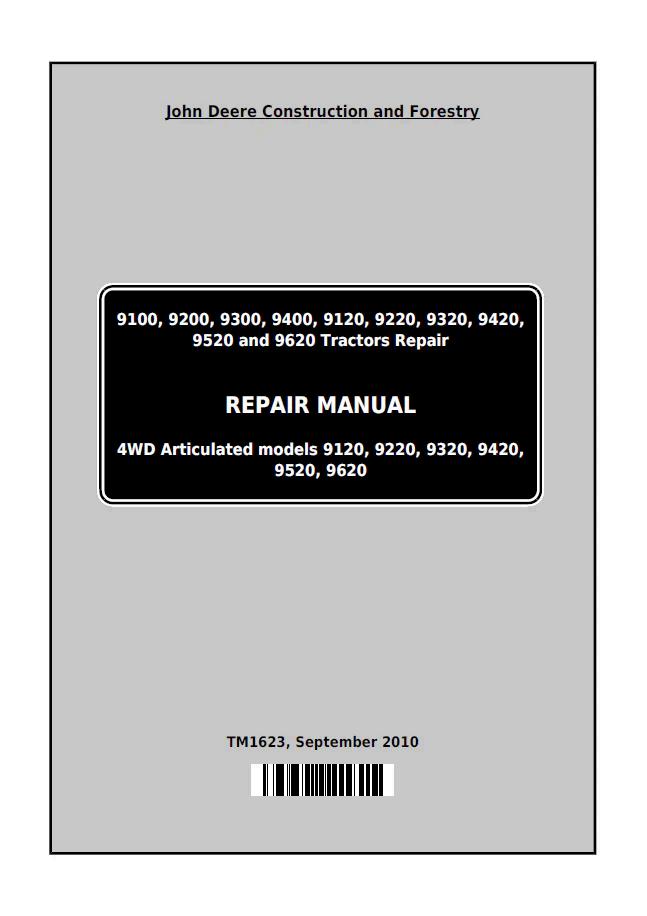 John Deere 9100, 9200, 9300, 9400, 9120, 9220, 9320, 9420, 9520 and 9620 Tractors Repair Manual TM1623 PDF Comprehensive technical service manual covering the complete 9000 series tractor lineup. This official TM1623 documentation provides detailed repair procedures, diagnostic guidance, and maintenance specifications for all ten models. Essential resource for technicians, operators, and fleet managers requiring factory-authorized repair information. Includes step-by-step instructions, component specifications, troubleshooting protocols, and parts identification. Digital PDF format enables quick reference and searchability for efficient problem-solving in the field or workshop.