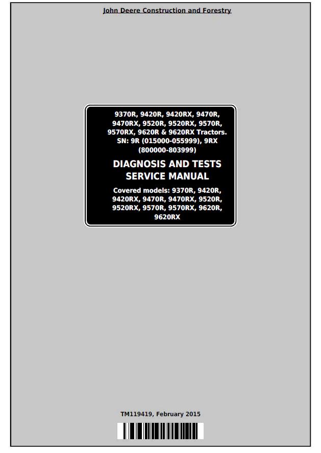 Comprehensive diagnostic and testing service manual for John Deere's premium articulated tractor lineup, covering models 9370R through 9620RX. This TM119419 manual delivers detailed construction and forestry operation guidance, including troubleshooting procedures, system diagnostics, and maintenance protocols. Essential reference for technicians and operators requiring in-depth knowledge of these high-performance machines. PDF format enables quick access to critical service information across all specified models.
