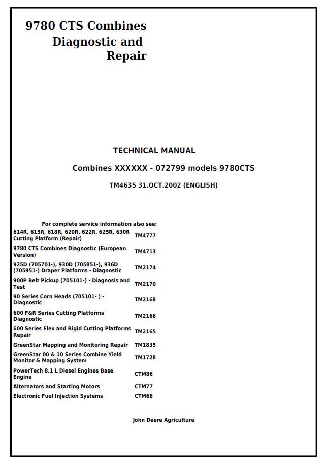 John Deere 9780 CTS Combines Technical Manual TM4635 provides comprehensive service and repair documentation for this high-capacity harvesting system. This PDF manual delivers detailed specifications, troubleshooting procedures, maintenance schedules, and component diagrams essential for technicians and operators. Access critical information on engine performance, hydraulic systems, grain handling mechanisms, and electrical configurations. Ideal for authorized dealers, service centers, and equipment managers requiring factory-level technical guidance to maintain peak operational efficiency and minimize downtime.