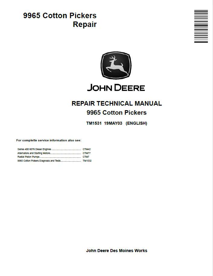 John Deere 9965 Cotton Pickers Repair Technical Manual TM1531 provides comprehensive service and maintenance guidance for operators and technicians. This official documentation covers diagnostics, component repair procedures, troubleshooting protocols, and parts specifications essential for optimal equipment performance. Ideal for workshop professionals and fleet managers requiring authoritative technical reference material. Digital PDF format ensures immediate access to critical repair information whenever needed.