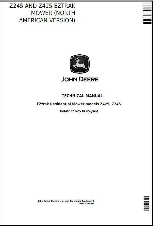 John Deere EZtrak Residential Mower models Z425, Z245 Technical Manual TM1498 PDF Comprehensive technical documentation for John Deere EZtrak Z425 and Z245 zero-turn mowers. This official TM1498 manual delivers detailed specifications, maintenance procedures, troubleshooting guides, and operational instructions essential for equipment owners and technicians. Access critical information on engine performance, hydraulic systems, cutting deck adjustments, and component replacement protocols. Ideal for maximizing equipment longevity and ensuring optimal performance across residential mowing applications.