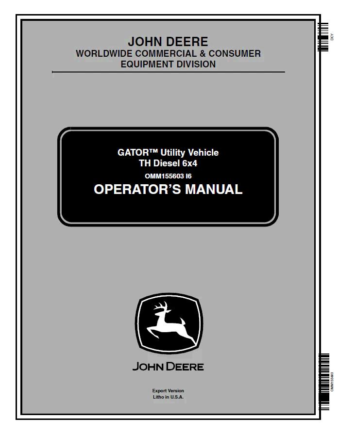 John Deere GATOR™ Utility Vehicle TH Diesel 6x4 Operator Manual OMM155603 Comprehensive operator manual for the John Deere GATOR™ TH Diesel 6x4 utility vehicle. This essential reference document covers operation, maintenance, safety procedures, and troubleshooting for optimal equipment performance. Designed for operators and maintenance personnel, the manual provides detailed specifications, service intervals, and technical guidance. Reference number OMM155603. Digital PDF format for convenient access and searchability.