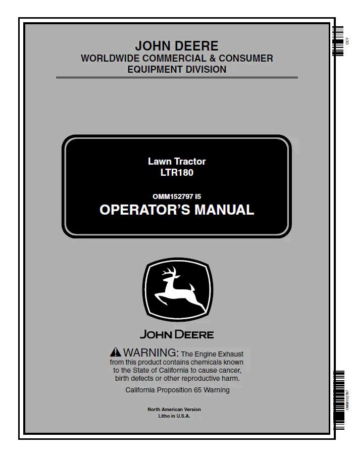 John Deere LTR180 Lawn Tractors Operator Manual OMM152797 PDF Master the operation and maintenance of your John Deere LTR180 with this comprehensive official operator manual. Document OMM152797 provides detailed guidance on equipment setup, safe operating procedures, routine maintenance schedules, and troubleshooting. Essential reference material for owners and operators seeking to maximize performance and longevity of their lawn tractor. Digital PDF format ensures convenient access to critical information whenever needed.