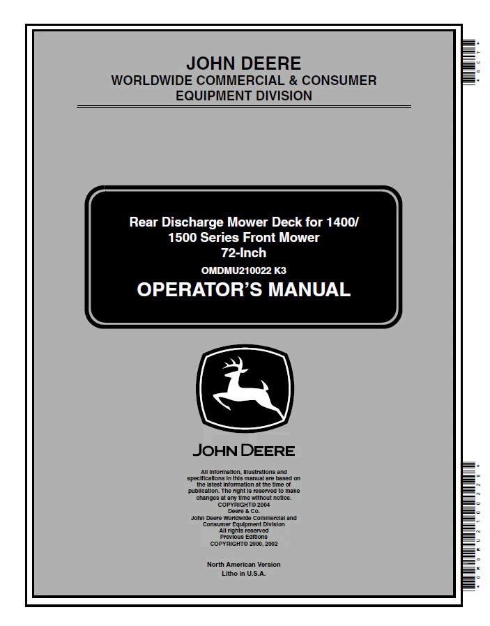 John Deere Rear Discharge Mower Deck for 1400/1500 Series Front Mower 72-Inch Operator Manual OMDMU210022 PDF Essential operator documentation for the John Deere 72-inch rear discharge mower deck designed for 1400/1500 series front mowers. This comprehensive manual (OMDMU210022) provides detailed guidance on equipment operation, maintenance procedures, safety protocols, and troubleshooting. Ideal for equipment operators, maintenance technicians, and fleet managers requiring authoritative reference material. Digital PDF format ensures convenient access across devices and job sites. Covers specifications, assembly instructions, and best practices for optimal deck performance and longevity.