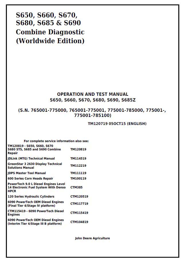 John Deere S-Series Combine Operation and Test Manual (TM120719) covering models S650, S660, S670, S680, S685, and S690. This comprehensive PDF guide delivers detailed operational procedures, maintenance protocols, and diagnostic testing procedures essential for equipment operators and technicians. Access critical information on machine setup, performance optimization, troubleshooting, and component testing. Ideal for agricultural professionals requiring authoritative technical documentation to maximize combine efficiency and ensure proper equipment management across the entire S-Series lineup.