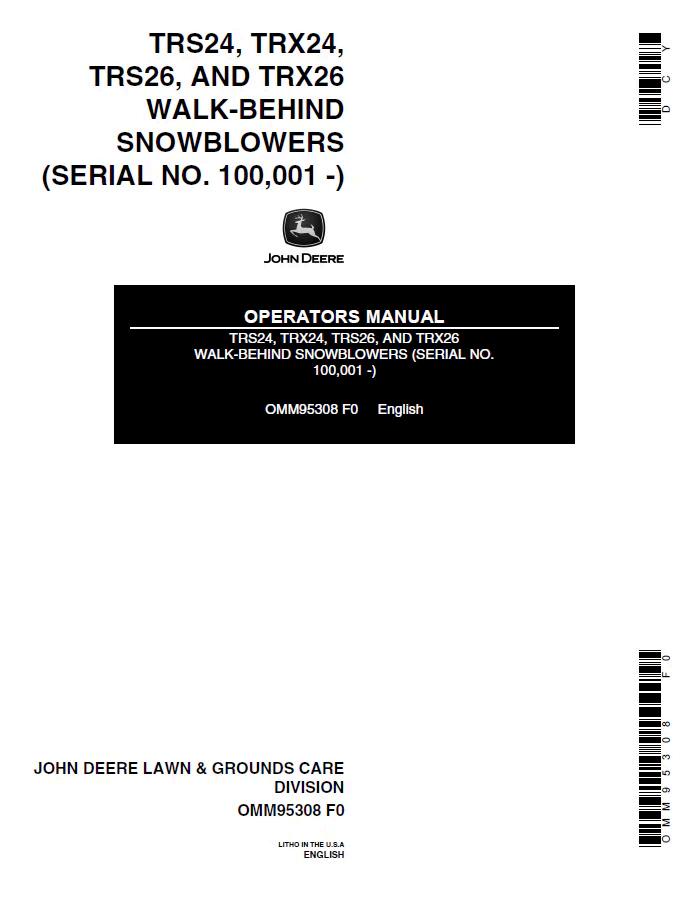 John Deere TRS24, TRX24, TRS26, and TRX26 walk-behind snowblower operator manual (OMM95308). This comprehensive PDF guide covers operation, maintenance, and troubleshooting for all four models. Essential reference for safe equipment handling, seasonal preparation, and routine service procedures. Includes detailed diagrams, specifications, and warranty information. Ideal for owners and operators seeking authoritative guidance on maximizing performance and longevity of their John Deere snow removal equipment.