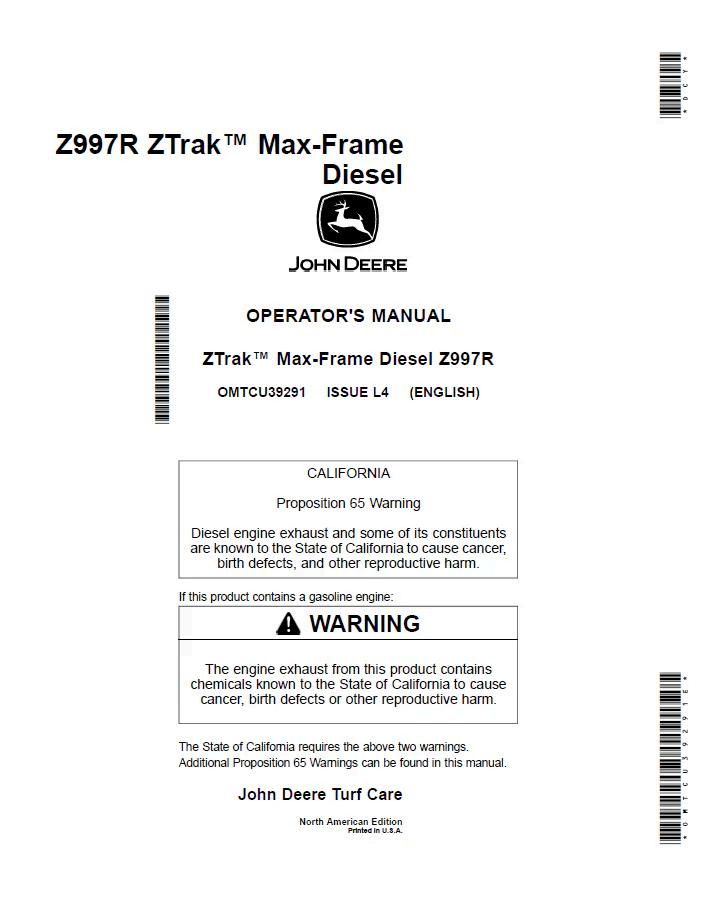 John Deere ZTrak™ Max-Frame Diesel Z997R Operator Manual OMTCU39291 provides comprehensive guidance for equipment operation, maintenance, and troubleshooting. This official PDF manual delivers detailed specifications, safety protocols, and service procedures essential for optimal performance and longevity. Ideal for operators, technicians, and fleet managers seeking authoritative documentation for the Z997R diesel zero-turn mower. Ensure proper equipment handling and maintenance with manufacturer-backed instructions.