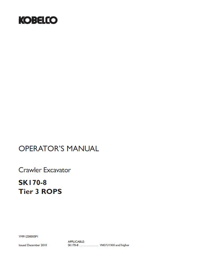 Comprehensive operator manual for the Kobelco SK170-8 Tier 3 ROPS crawler excavator. This detailed PDF guide covers machine specifications, operation procedures, maintenance schedules, safety protocols, and troubleshooting. Essential reference material for equipment operators, technicians, and fleet managers. Includes diagrams, control layouts, and performance data to ensure safe and efficient machine operation. Digital format allows instant access across devices for on-site or office use.