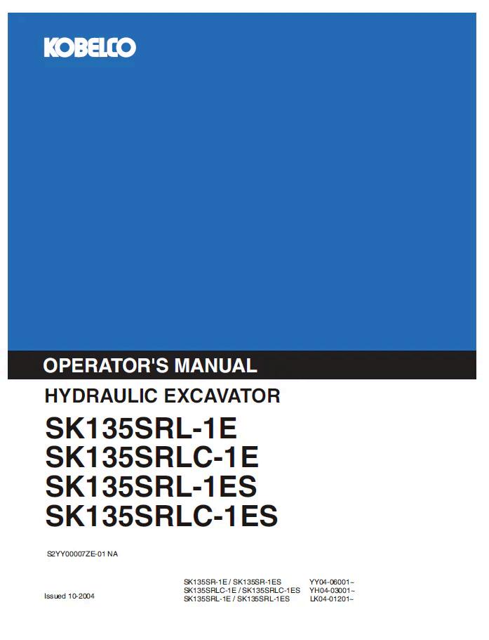 Comprehensive operator manual for Kobelco SK135SRL series hydraulic excavators, covering models SK135SRL-1E, SRLC-1E, SRL-1ES, and SRLC-1ES. This essential reference guide provides detailed operating procedures, maintenance schedules, safety protocols, and troubleshooting information. Designed for equipment operators and maintenance personnel, the manual ensures proper machine operation, extends equipment lifespan, and maintains workplace safety standards. Digital PDF format allows instant access to critical specifications and operational guidance whenever needed on-site or in the office.
