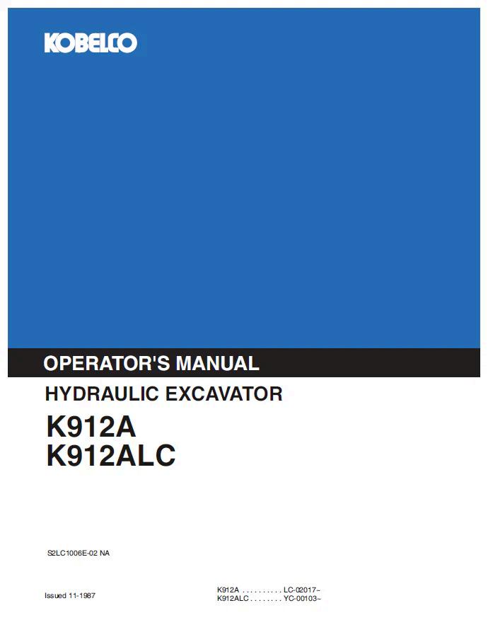 Comprehensive operator manual for Kobelco K912A and K912ALC hydraulic excavators in PDF format. This essential reference guide covers machine specifications, operation procedures, maintenance schedules, safety protocols, and troubleshooting guidance. Ideal for equipment operators, maintenance technicians, and fleet managers seeking authoritative documentation. Ensure optimal performance and compliance with manufacturer standards using this detailed technical resource.