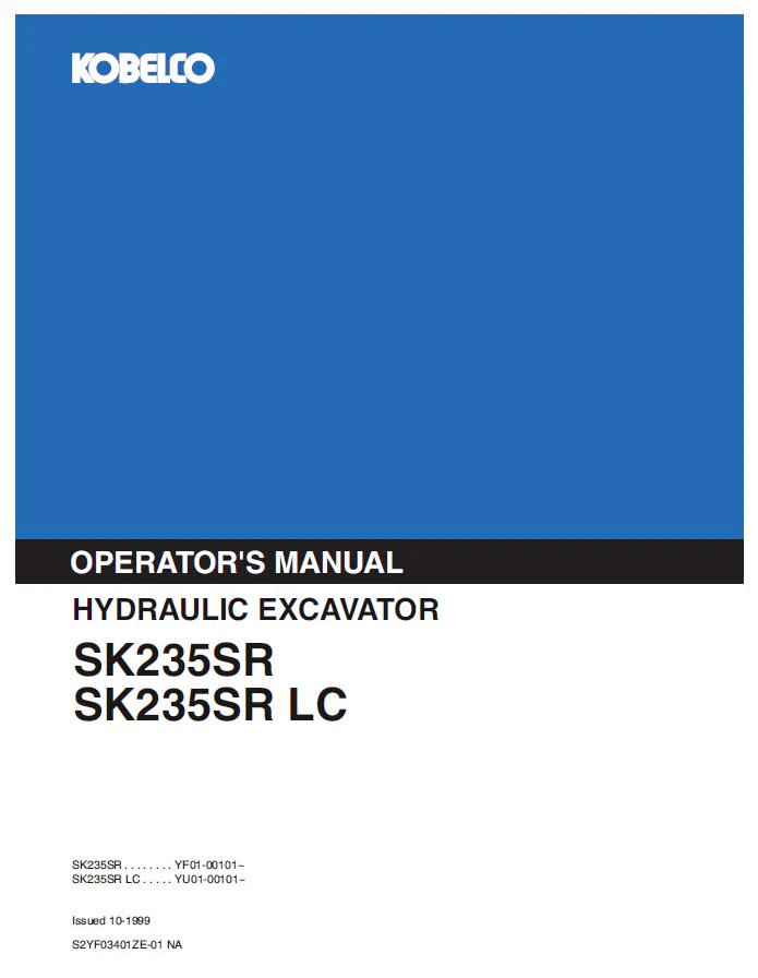 Comprehensive operator manual for Kobelco SK235SR and SK235SRLC hydraulic excavators (model S2YF03401ZE01). This essential PDF guide covers machine specifications, operation procedures, maintenance schedules, safety protocols, and troubleshooting. Designed for equipment operators and maintenance personnel, it provides detailed instructions for optimal performance and longevity. Ensure safe and efficient excavator operation with manufacturer-backed documentation. Digital download for immediate access.