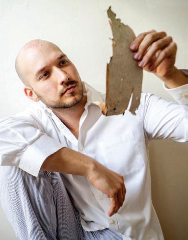Left, Emily Martin, June, 2022, Floor loom woven cloth using cotton and wool yarn dyed by the artist. Above, Phillip Gladkov with a birch bark piece for his film project.