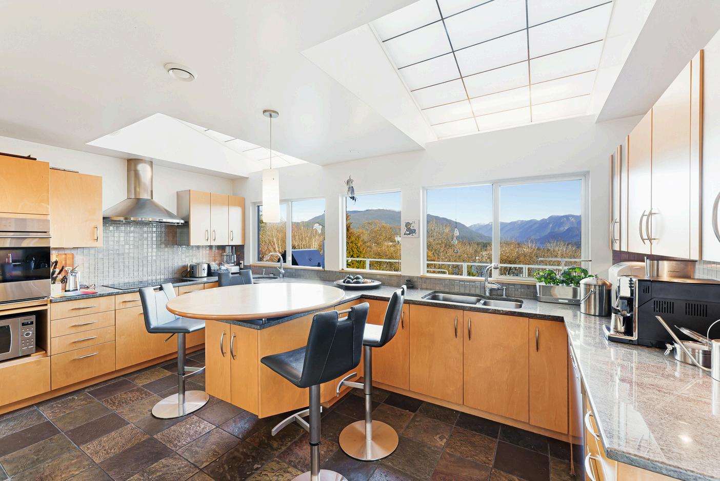 The separate large chef's kitchen is outfitted with high-end appliances and has french doors leading to one of the four private terraces this home has to offer Walk up the custom staircase to two spacious bedrooms, also with private balconies overlooking downtown Manhattan