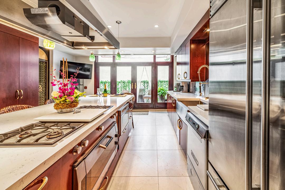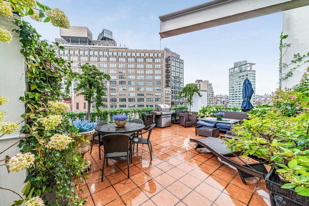 La gran cocina independiente está equipada con electrodomésticos de alta gama y tiene puertas francesas que conducen a una de las cuatro terrazas privadas que esta casa tiene para ofrecer. Suba por la escalera de diseño a dos amplios dormitorios, también con balcones privados y con vistas al centro de Manhattan