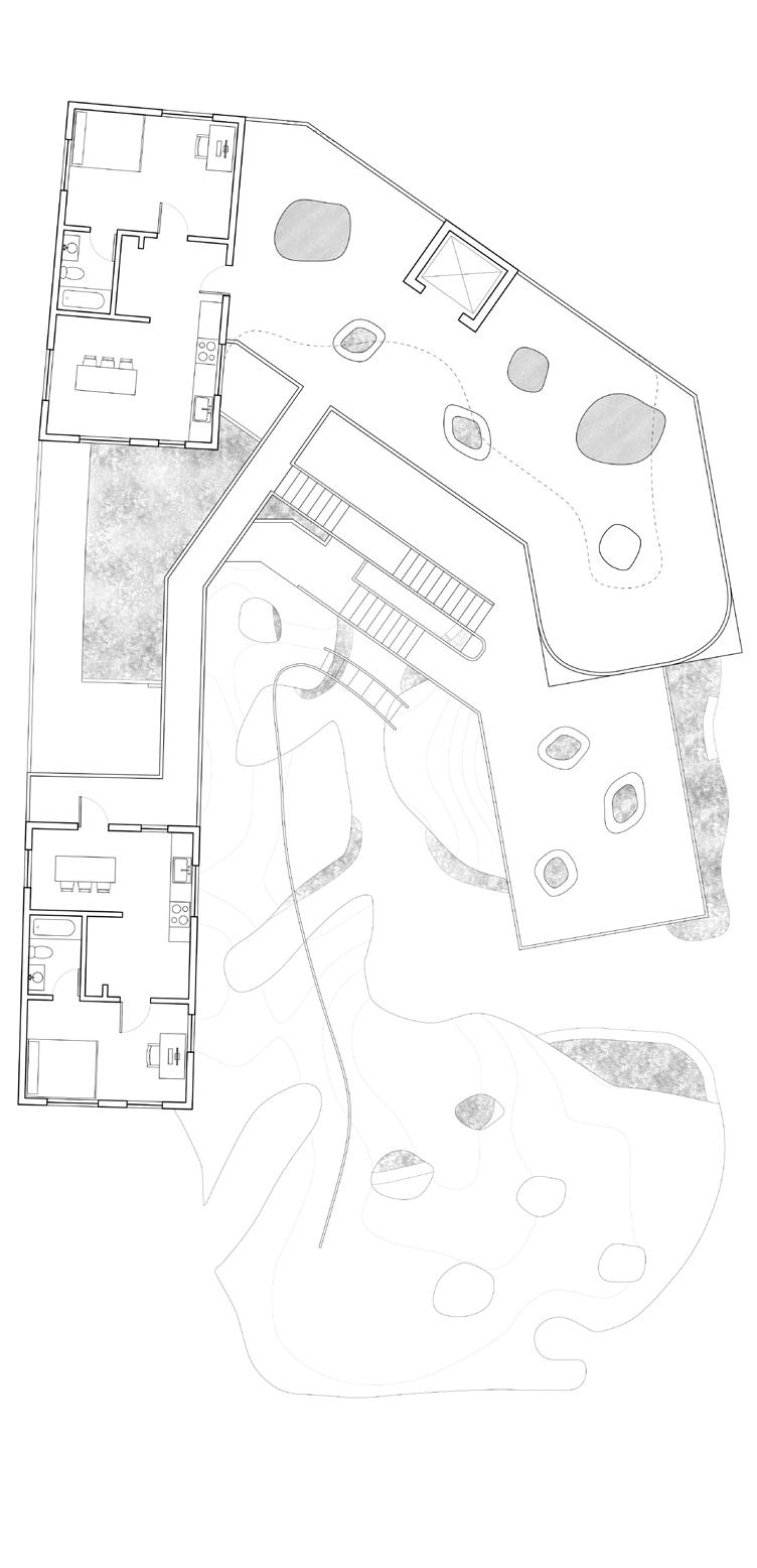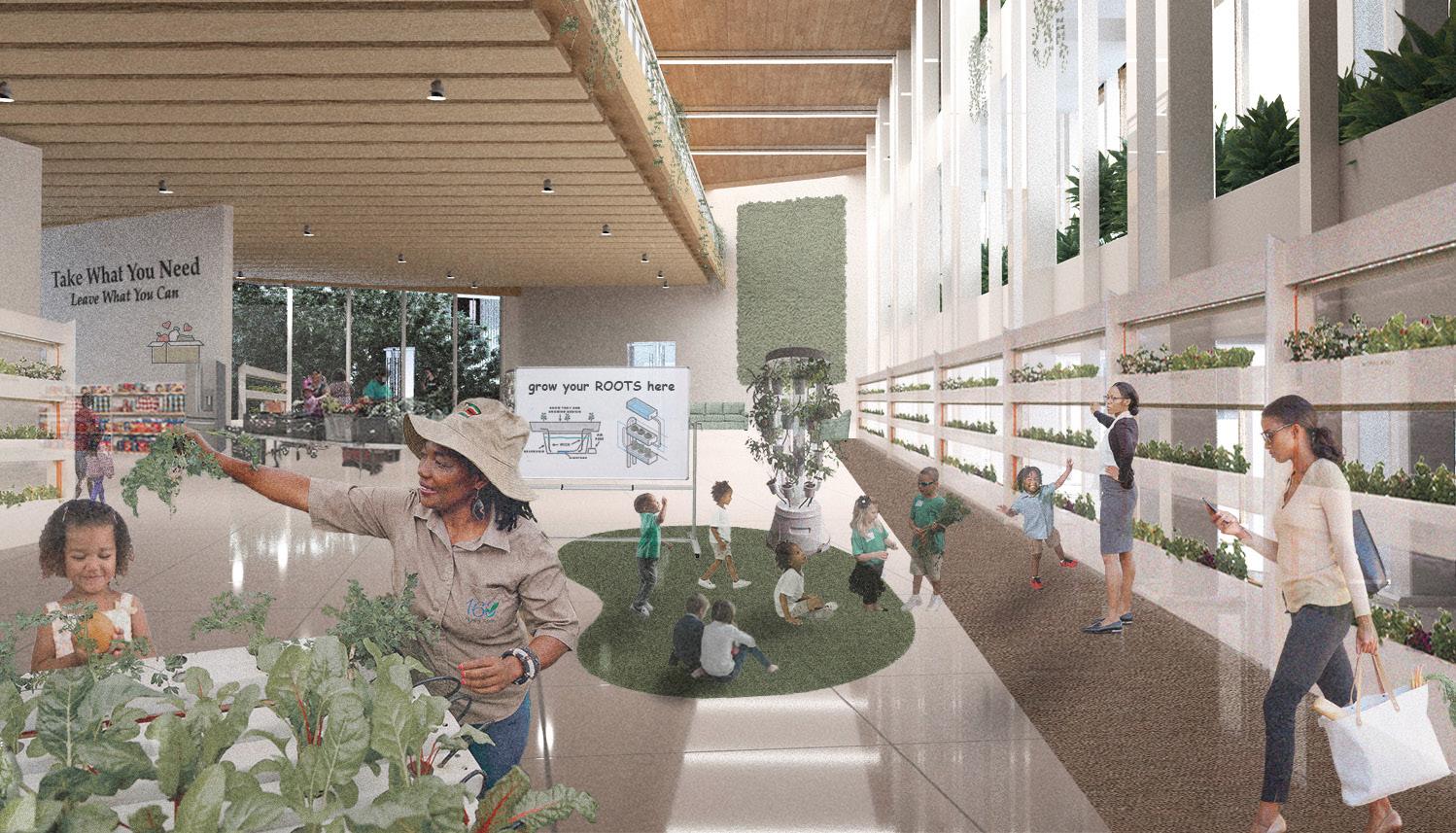 Families that called Albina home for generations found themselves displaced, their bonds severed, and their cultural roots wretched from the soil that had nurtured a sense of place and belonging. Unjust forces of gentrification systematically dismantled food systems, while simultaneously uprooting communities from places they once called home. Located on the former site of the Hill Block Building that had been the core of the business community, the design creates opportunities to reclaim spatial agency. This culturally rich, local hub supports a range of housing types while also centralizing amenities that can bring the community together. ROOTS rekindles and reconnects with cultural heritage through food, sharing stories in the face of adversity, and cultivating reciprocal relationships with local ecologies.